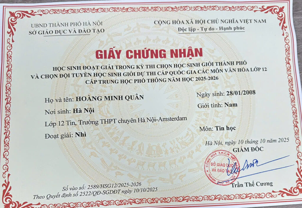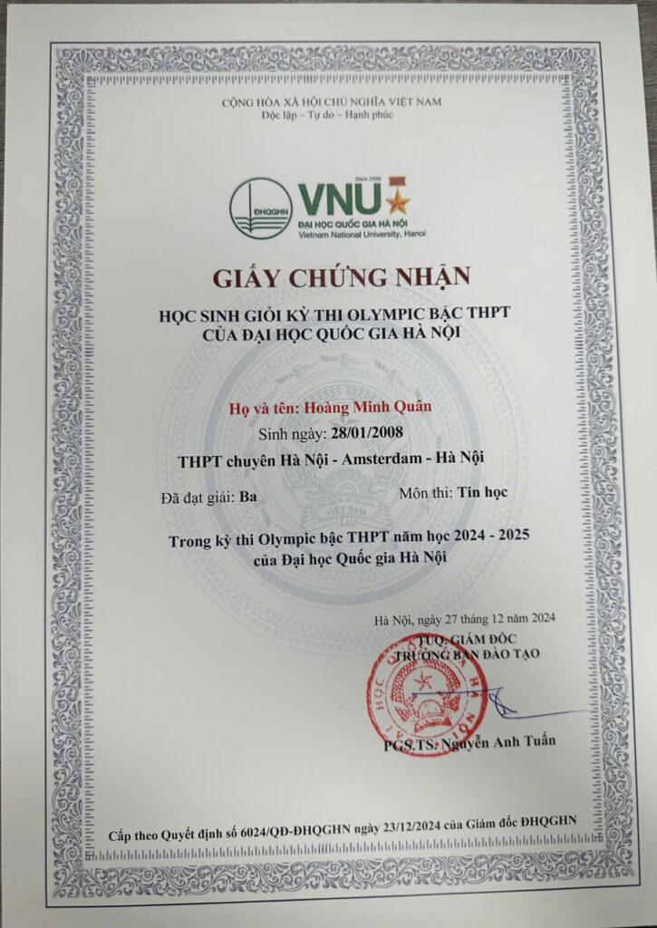 - 🥉 Third Prize – VNU High School Olympiad | 2025–2026