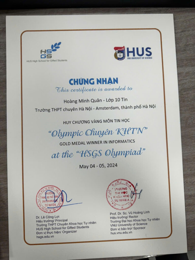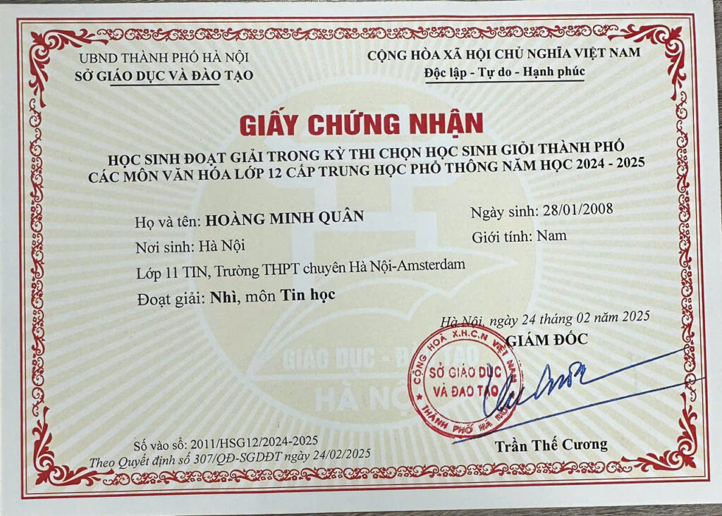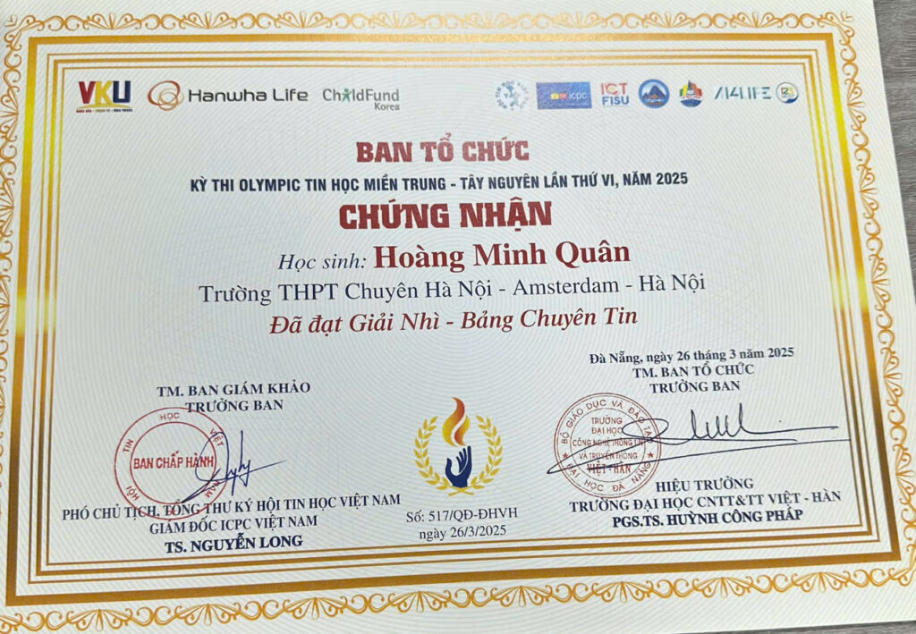 - 🥉 Third Prize – Northern Vietnam Informatics Contest (2 consecutive years)